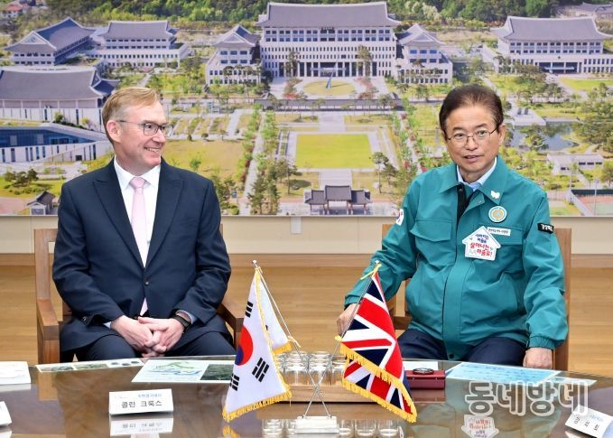 동네방네 김형규 기자 | 이철우 경상북도지사는 3일 도청을 방문한 콜린 크룩스(Colin Crooks) 주한 영국대사 내외와 만나, 경주 APEC 정상회의의 성공적 개최 협력 방안과 함께 산업·문화·교육 등 다양한 분야의 교류 확대를 논의했다.