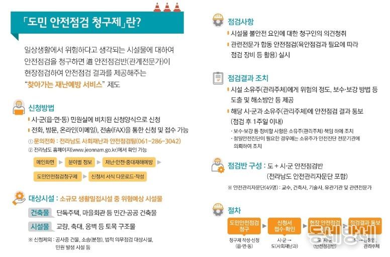 동네방네 김형규 기자 | 전라남도는 각종 재난으로부터 도민의 생명과 재산을 보호하고 일상 생활주변에 불안전한 위험요소를 찾아 무료로 안전점검하는 ‘도민 안전점검 청구제’를 운영하고 있다고 밝혔다.