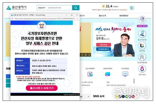 동네방네 김형규 기자 | 울산시는 국가정보자원관리원 대전센터 화재(9.26)로 인해 국민신문고 서비스가 전면 중단됨에 따라, 시민 불편을 최소화하기 위해 울산시 대표 홈페이지 내 온라인 민원창구 ‘울산신문고’를 10월 5일부터 운영한다.