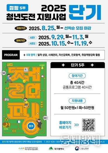 동네방네 김형규 기자 | 대구광역시는 청년의 구직 의욕 회복과 진로탐색 기회를 제공하기 위해 청년도전지원사업 ‘젊핑’ 단기(5주) 과정 참여자 50명을 선착순 모집한다.