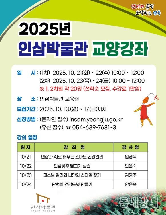 동네방네 김형규 기자 | 영주시 인삼박물관은 2025 영주 풍기인삼축제와 연계해 오는 10월 21일부터 24일까지 시민을 대상으로 생활 속 건강과 문화를 접목한 특별 교양강좌를 운영한다.