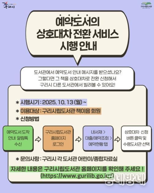 동네방네 김형규 기자 | 구리시는 오는 10월 13일부터 시민들의 도서 이용 편의성을 높이기 위해‘시립도서관 예약 도서 상호대차 전환 서비스’를 새롭게 운영한다고 밝혔다.