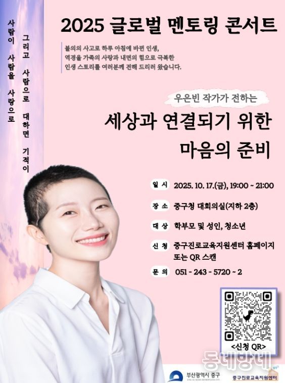 동네방네 김형규 기자 | 부산 중구는 중구 진로교육지원센터 주관으로 오는 10월 17일 오후 7시, 중구청 지하2층 대회의실에서 '2025 글로벌 멘토링 콘서트'를 개최한다.