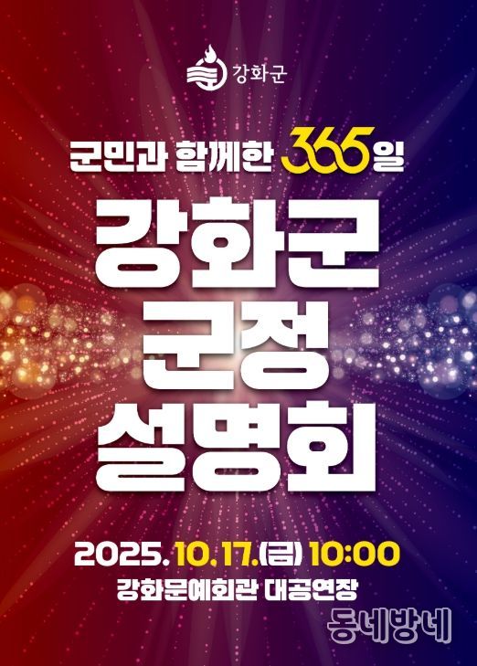 동네방네 김형규 기자 | 강화군은 오는 10월 17일 오전 10시 강화문예회관에서 “군민과 함께한 365일, 강화군 군정 설명회”를 개최한다.
