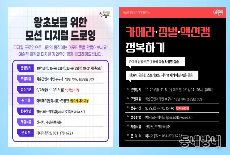 동네방네 김형규 기자 | 화순군(군수 구복규)은 오는 10월 15일과 20일 화순군 청년센터(청춘들락) 미디어공작소에서 영상 제작과 디지털드로잉 분야의 창의적 미디어 교육 프로그램을 시작한다고 밝혔다.