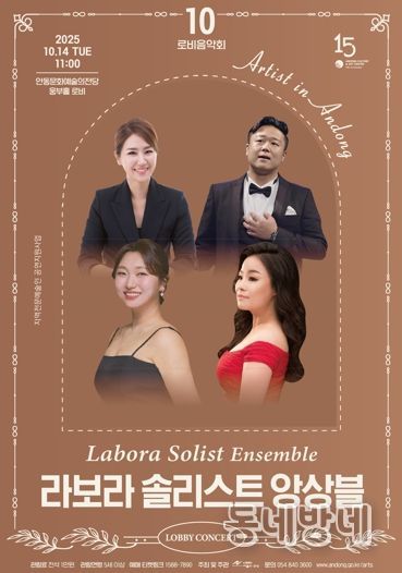 동네방네 김형규 기자 | 안동문화예술의전당은 지역예술인들에게 다양한 무대 경험을 제공하고, 시민에게는 일상 속 음악 향유의 기회를 선사하기 위해 매월 첫째 주 화요일 오전 11시 로비음악회 시리즈를 진행하고 있다. 오는 10월 14일 오전 11시, '라보라 솔리스트 앙상블'이 안동문화예술의전당 웅부홀 로비에서 열린다.