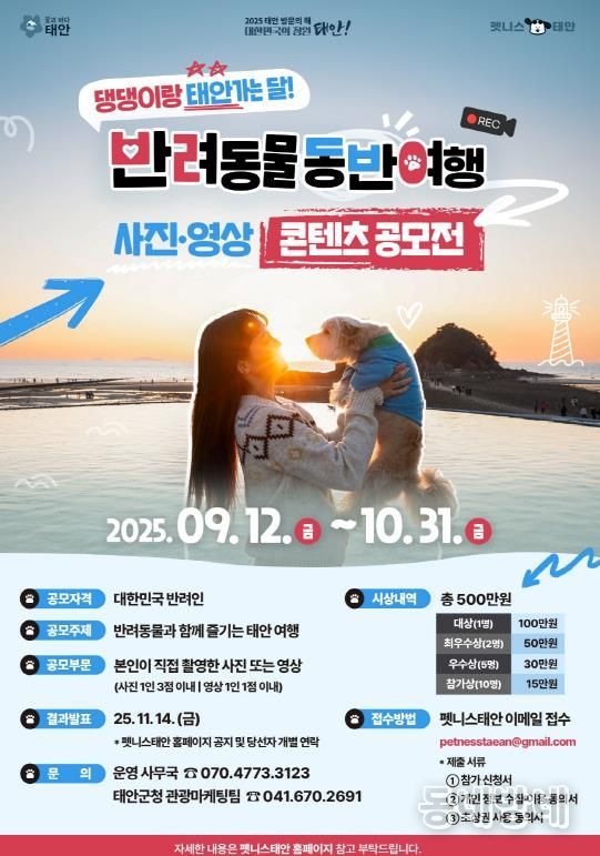 이번 공모전은 반려동물 친화관광도시 태안을 널리 알리고 동반 여행을 활성화하기 위한 것으로, 참여 가능한 콘텐츠는 태안 여행 중 본인이 직접 촬영한 사진이나 영상이다.