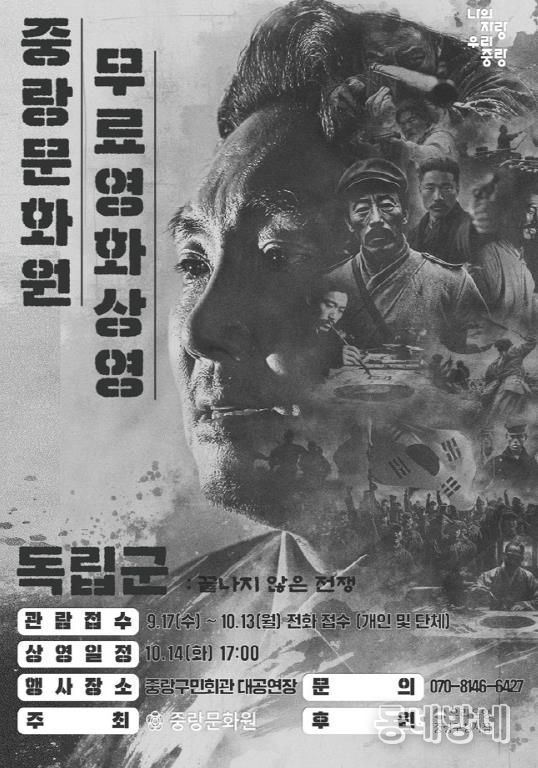 동네방네 김형규 기자 | 중랑구는 오는 10월 14일 오후 3시와 5시, 중랑구민회관 대공연장에서 광복 80주년을 기념하는 영화 ‘독립군’을 상영한다. 이번 상영회는 중랑문화원이 주최해 선열들의 희생과 숭고한 뜻을 되새기는 특별한 자리로 마련됐다.