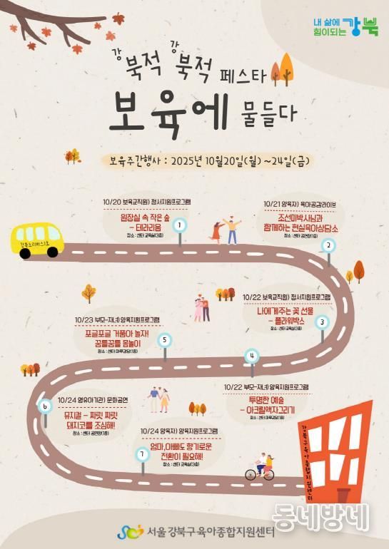 동네방네 김형규 기자 | 서울 강북구는 강북구육아종합지원센터가 오는 10월 20일부터 24일까지 보육주간 기념행사 ‘북적북적 페스타-보육에 물들다’를 개최한다고 밝혔다.
