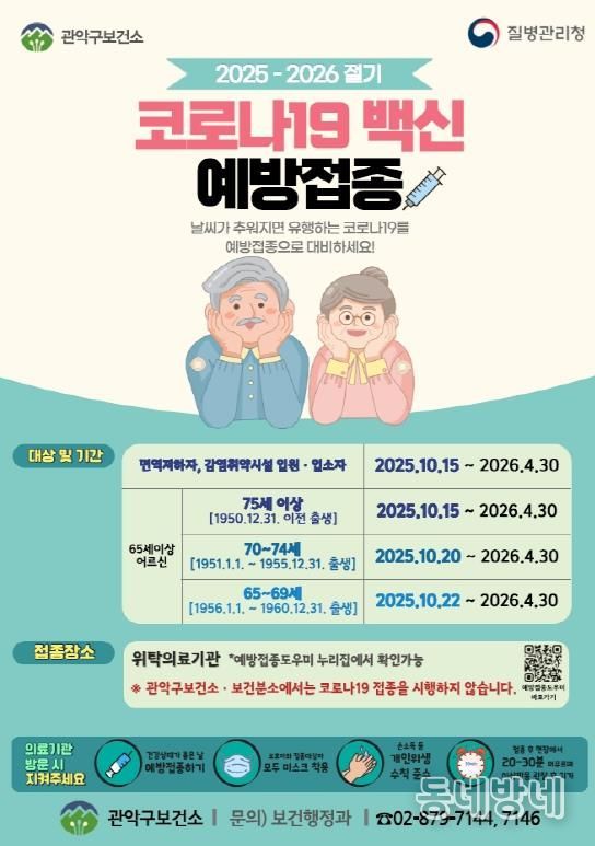 동네방네 김형규 기자 | 관악구가 호흡기 질환이 증가하는 동절기 대비, 코로나19 감염 고위험군을 대상으로 코로나19 백신 무료 접종을 실시한다.