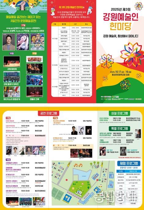 동네방네 김형규 기자 | 강원예술인과 도민의 화합·소통·공감을 위한 '2025 제3회 강원예술인 한마당' 행사가 오는 10월 17일부터 19일까지 3일간 횡성문화체육공원 일원에서 열린다.