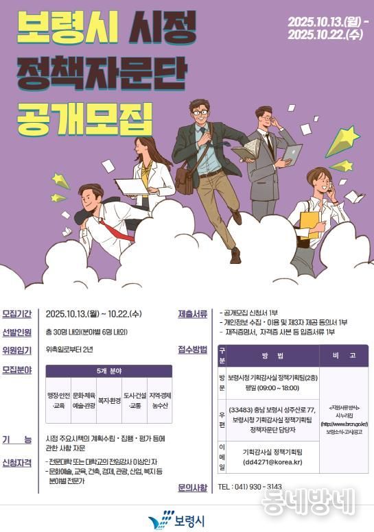 동네방네 김형규 기자 | 보령시는 지역 시정 발전에 대해 조언·권고·건의 등의 자문을 얻고자 보령시 시정 정책자문단 신규 위원을 10월 13일부터 22일까지 10일간 공개 모집한다고 밝혔다.
