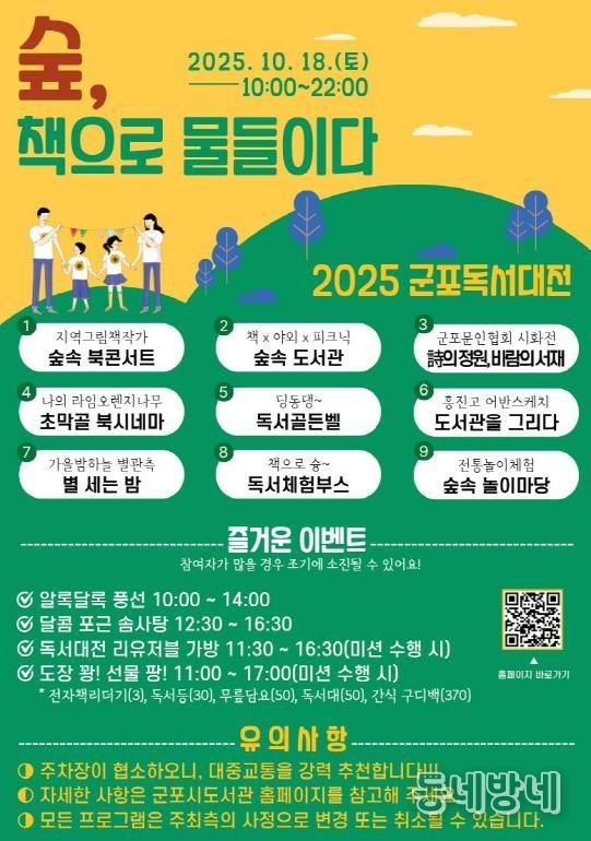 하은호 군포시장은 “2025 군포독서대전은 단순한 책 축제가 아니라 시민이 책과 자연 속에서 교감하며 휴식과 영감을 얻는 문화의 장이 될 것”이라며 “책 읽는 도시 군포의 정체성을 강화하고 시민의 문화적 자긍심을 높이는 대표 축제로 발전시켜 나가겠다”고 밝혔다.