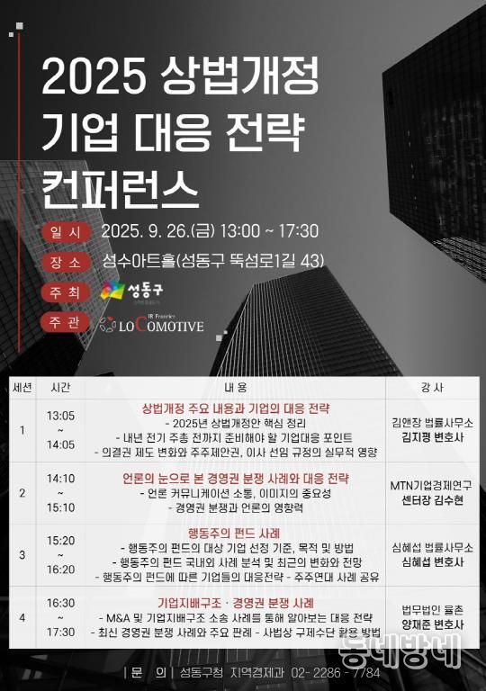 동네방네 김형규 기자 | 서울 성동구는 지난달 26일 성수타운매니지먼트(Seongsu Town Management) 사업의 일환으로 진행된 '2025 상법개정과 기업의 대응전략' 컨퍼런스를 성공적으로 마쳤다고 밝혔다.