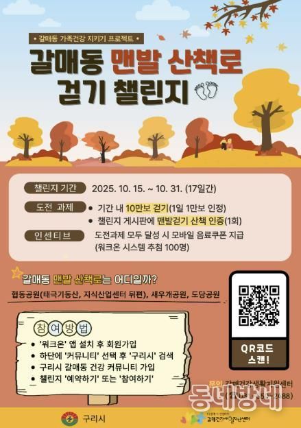 동네방네 김형규 기자 | 구리시는 가을철 주민들의 건강한 생활 습관 형성과 스트레스 완화를 위해 ‘갈매동 맨발 산책로 걷기 챌린지’를 오는 10월 15일부터 31일까지 17일간 운영한다고 밝혔다.