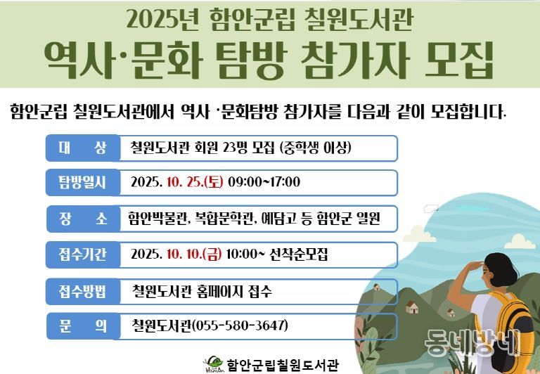 동네방네 김형규 기자 | 함안군립 칠원도서관이 '2025년 하반기 역사·문화탐방' 프로그램 참가자를 모집한다.