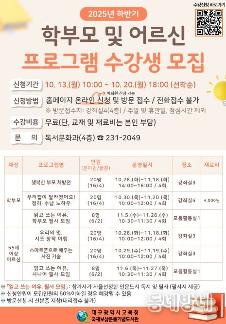 동네방네 김형규 기자 | 국채보상운동기념도서관은 학부모 및 노년층의 건강, 행복 및 자기계발을 위해 10월 28일부터 11월 27일까지 학부모 대상 프로그램 3개, 어르신 대상 3개 프로그램을 운영한다.