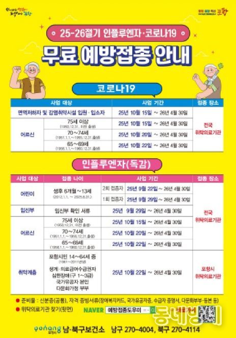 동네방네 김형규 기자 | 포항시는 오는 15일부터 2025~2026절기 고위험군 대상 코로나19 예방접종을 실시한다고 밝혔다.
