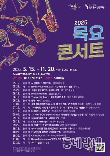 동네방네 김형규 기자 | 광주문화재단(대표이사 노희용)은 오는 10월 16일, 23일, 30일 목요일 저녁 7시 30분, 빛고을아트스페이스 5층 소공연장에서 ‘10월의 목요콘서트’를 개최한다고 밝혔다.