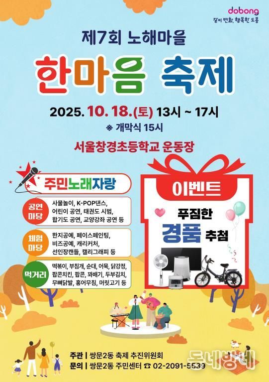 동네방네 김형규 기자 | 서울 도봉구 쌍문2동이 10월 18일 오후 1시 서울창경초등학교에서 ‘제7회 노해마을 한마음 축제’를 개최한다.