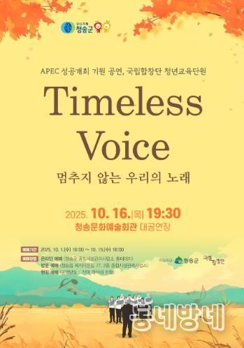 동네방네 김형규 기자 | 청송군은 오는 16일 저녁 7시 30분, 청송문화예술회관 대공연장에서 APEC 성공개최를 기원하는 국립합창단 청년교육단원 공연 ‘Timeless Voice – 멈추지 않는 우리의 노래’를 개최한다.