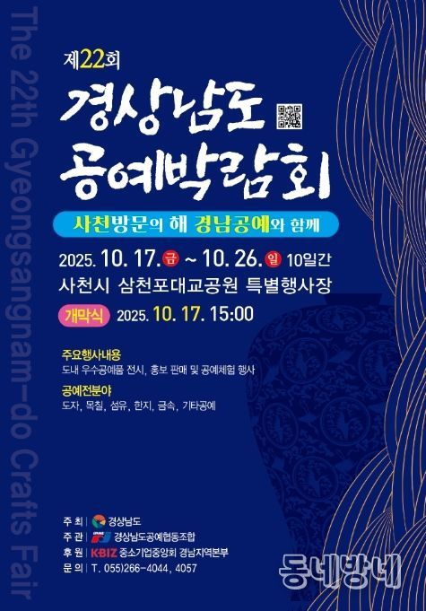 동네방네 김형규 기자 | 경상남도는 10월 17일부터 26일까지 10일간 사천시 삼천포대교공원 특별행사장에서 ‘제22회 경남 공예박람회’를 개최한다고 밝혔다.