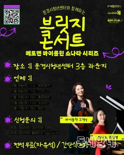 동네방네 김형규 기자 | 문경시청년센터는 오는 10월부터 12월까지 문경시청년센터 3층 라운지에서 클래식을 주제로 한‘브릿지 콘서트’를 연다.