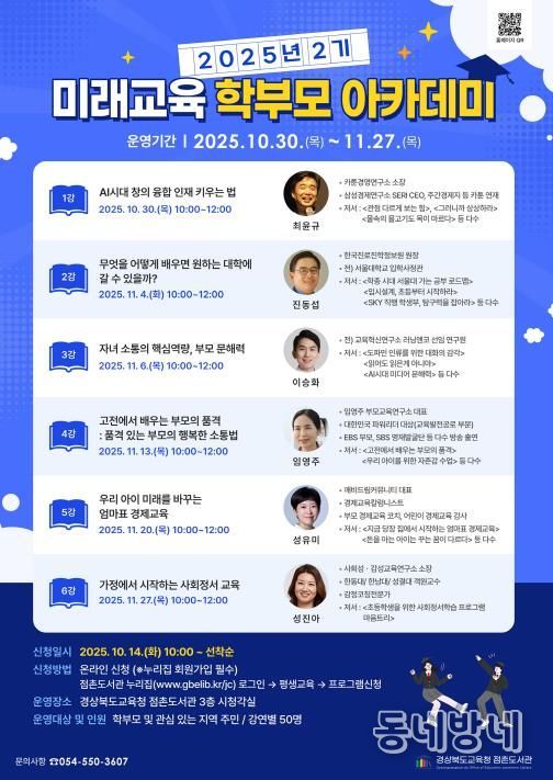 동네방네 김형규 기자 | 경상북도교육청 점촌도서관은 10월 30일부터 11월 27일까지 학부모 및 일반인을 대상으로 2025년 2기'미래교육 학부모 아카데미'를 운영한다.