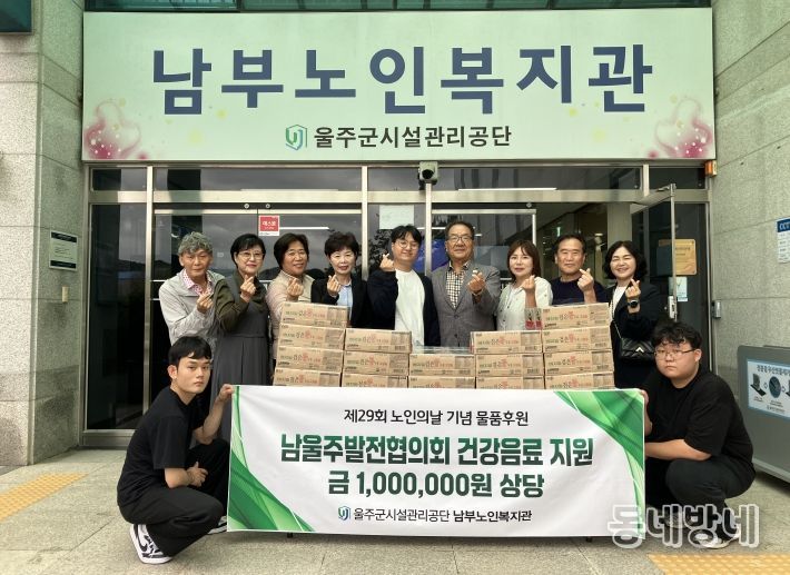 동네방네 김형규 기자 | 울주군시설관리공단 남부노인복지관(관장 조덕행)은 10월 14일 남울주발전협의회(회장 한성율)로부터 100만원 상당의 건강음료 1,000개를 기부받았다.