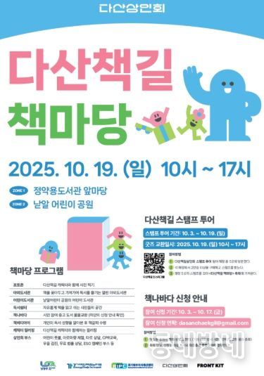 “다산책길 책마당” 행사는 책과 함께 여유를 즐길 수 있는 야외도서관과 독서쉼터가 조성되고, 시민 참여 중고 도서 물물교환 책나바다, 개인의 독서성향을 알아볼 수 있는 책비티아이, 컬러링 아트, 어린이 풋볼, 아로마테라피, 타투 스티커 등 다양한 체험 프로그램이 마련됐으며, 현직 변호사의 무료 법률상담과 지식재산(IP) 전문가 상담, ESG 부스도 운영할 예정이다. 또한 에코백, 책갈피, 손수건, 노트, 타투 스티커 등 다산책길 캐릭터 굿즈가 다채로움을 더할 예정이다.