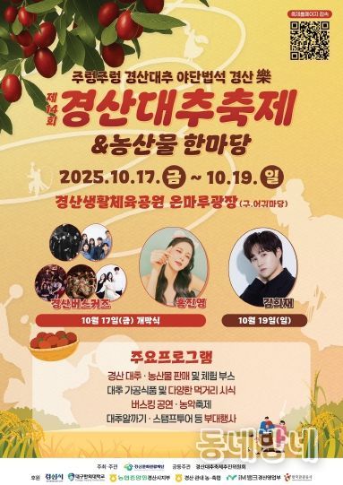 동네방네 김형규 기자 | (재)경산문화관광재단은 ‘제14회 경산대추축제 & 농산물 한마당’을 오는 17일부터 19일까지 3일간 경산생활체육공원 온마루광장(구 어귀마당)에서 개최한다.
