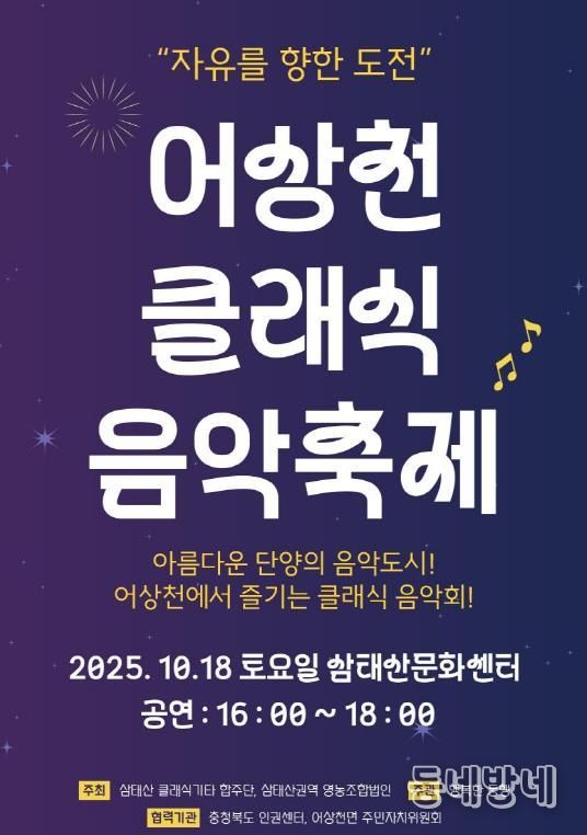 동네방네 김형규 기자 | 충북 단양군은 오는 18일, 어상천 삼태산문화센터에서 ‘제3회 어상천 클래식음악축제’가 열린다고 밝혔다.