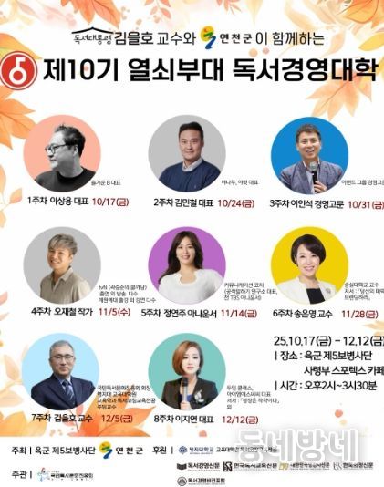 동네방네 김형규 기자 | 연천군과 육군 제5보병사단은 장병들의 지적 성장과 건전한 병영 독서문화 확산을 위한 '열쇠부대 독서경영대학' 제10기 개강식을 오는 10월 17일 개최한다. 이 프로그램은 2023년부터 전국 최초로 민·관·군 협력 독서교육으로 시작됐으며, 매 기수 약 50여 명의 군장병이 수료하며 꾸준한 호응을 얻고 있다.