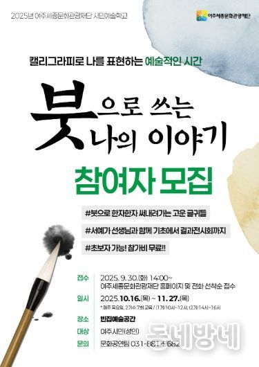 동네방네 김형규 기자 | 여주세종문화관광재단은 오는 10월 16일부터 두달간 여주시민을 위한 문화예술교육 프로그램인 시민예술학교 '붓으로 쓰는 나의 이야기'를 진행한다.