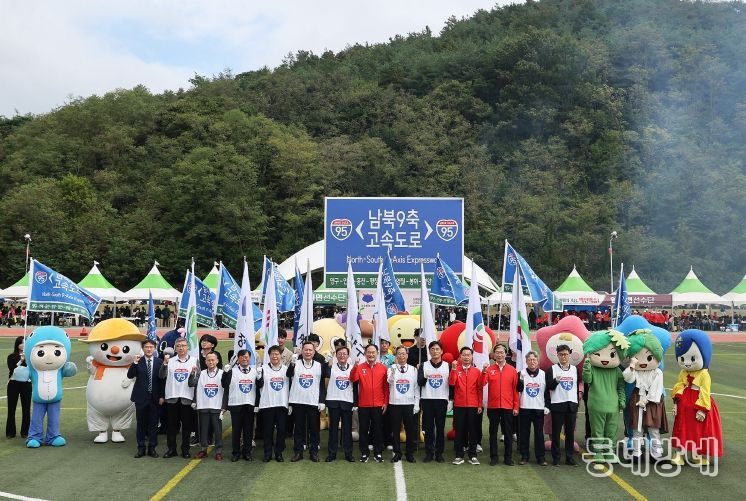 행사는 ‘남북9축, 함께 잇다’ 슬로건 아래 강원·경북 10개 시‧군 대표단이 운동장 양 끝에서 동시에 출발, 중앙에 위치한 제막무대에서 하나로 모여 ‘남북9축 고속도로’ 표지판을 공동 제막하는 순으로 진행됐다.