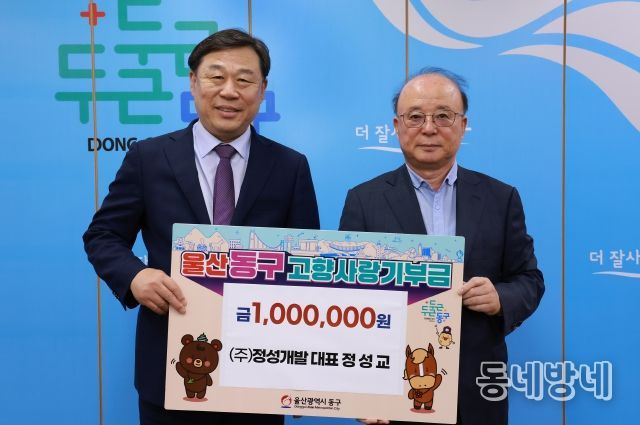 동네방네 김형규 기자 | 울산 동구는 10월 15일 오후 3시 30분, ㈜정성개발 정성교 대표가 김종훈 동구청장을 만나 고향사랑기부금 100만 원을 기탁했다.