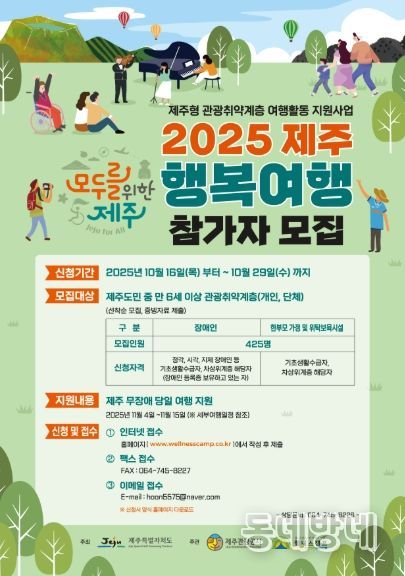 동네방네 김형규 기자 | 제주특별자치도와 제주관광공사는 오는 16일부터 29일까지 관광에서 소외되기 쉬운 취약계층에게 여행의 기회를 제공하기 위한 ‘제주 행복 여행’ 사업을 추진한다고 15일 밝혔다.