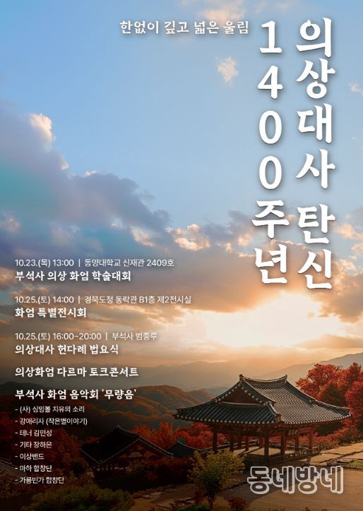조종근 문화예술과장은 “이번 의상대사 탄신 1400주년 기념행사는 그의 사상을 재조명하고, 화엄의 세계관을 현대적으로 해석하는 학문적·문화적 의미를 지닌 자리가 될 것”이라며 “의상대사가 창건하신 부석사에서 행사를 개최하게 되어 매우 뜻깊으며, 시민과 관광객이 함께하는 의미 있는 문화축제가 되길 바란다”고 말했다.
