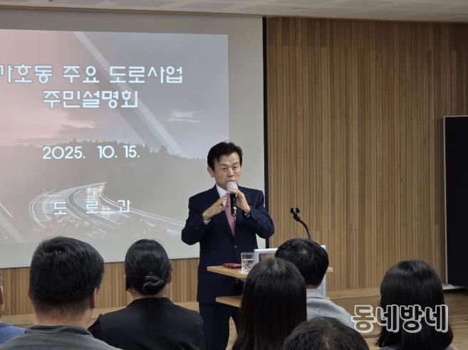 이번 설명회는 가호동 일원에서 추진 중인 통행불편 해소를 위한 ▲방아교차로 주변 도로 개선사업 ▲화물차 공영차고지 인근 교차로 개선사업 ▲은하수초등학교 앞 보도육교 개설사업 등 주요 도로사업 현황과 향후 계획을 주민들과 공유하고, 의견을 수렴하기 위해 마련됐다.