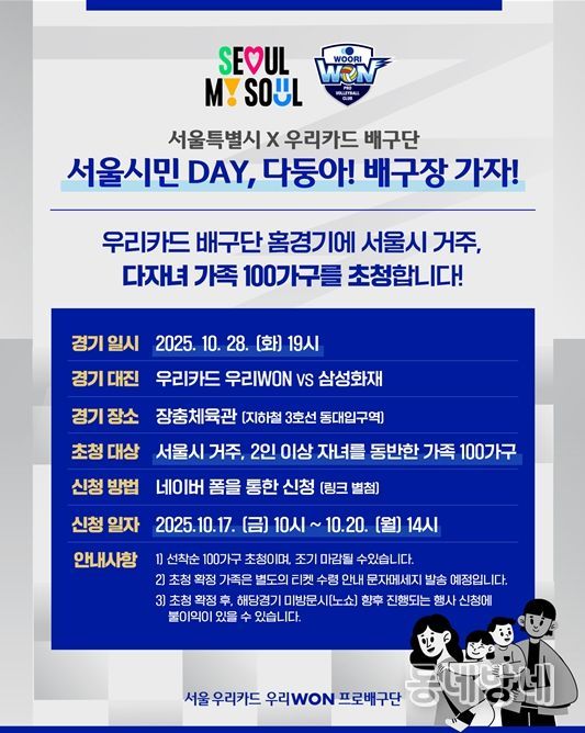 동네방네 김형규 기자 | 서울시가 ‘서울시민의 날(10월 28일)’을 맞아 28일 저녁 7시 장충체육관에서 열리는 서울시 연고 구단 ‘우리카드배구단’의 홈경기에 다자녀 100가족을 무료 초청하는 ‘서울시민 데이’를 진행한다.