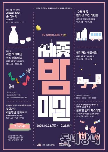 동네방네 김형규 기자 | (재)세종시문화관광재단(대표 박영국)이 오는 10월 23일부터 26일까지 4일간, 시민과 관광객을 대상으로 깊어가는 가을 정취를 온몸으로 느낄 수 있는 ‘10월 세종 밤마실 주간’을 개최한다.