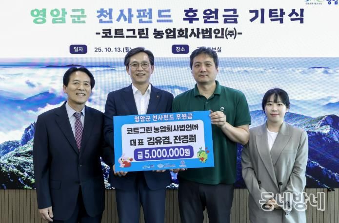 동네방네 김형규 기자 | 코트그린농업회사법인(주)가 13일 영암군청에 천사펀드 500만원, 고향사랑기부금 200만원을 각각 전달했다.