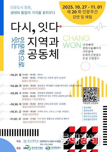 동네방네 김형규 기자 | 창원특례시는 제20회 인문주간을 맞아 ‘다시, 잇다 – 인문학으로 잇는 지역과 공동체’라는 주제로 오는 10월 27일부터 11월 1일까지 창원스펀지파크, 경남시청자미디어센터, 창원향교 일대에서 인문주간 행사를 개최한다.