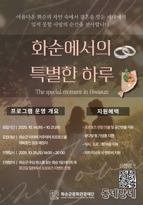 모집은 10월 14일(화)부터 10월 21일(화) 18:00까지로 화순군 외 지역에 거주하며 프로포즈를 계획 중인 커플 1팀을 모집한다. 신청은 별도의 폼 작성을 통한 온라인 접수로 가능하며, 최종선정자는 10월 22일(수) 개별 안내 예정이다.