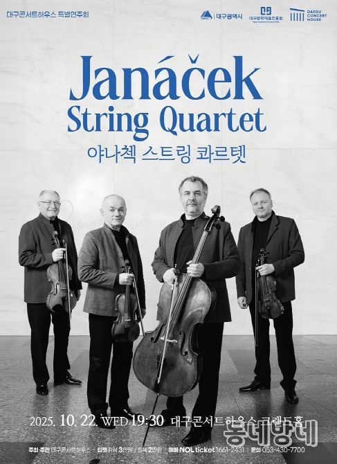 동네방네 김형규 기자 | (재)대구문화예술진흥원 대구콘서트하우스는 2025년 한-체코 수교 35주년을 맞아, 체코 정통 실내악의 깊이를 전하는 세계적인 현악4중주단 ‘야나첵 스트링 콰르텟(Janáček String Quartet)’의 내한공연을 오는 10월 22일 오후 7시 30분, 대구콘서트하우스 그랜드홀에서 개최한다.