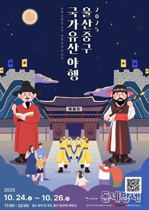 동네방네 김형규 기자 | 울산 중구가 오는 10월 24일부터 10월 26일까지 사흘 동안 울산 동헌 및 내아, 성남동 문화의거리, 울산 경상좌도병영성 일원에서 ‘2025 울산 중구 국가유산 야행’ 행사를 개최한다.
