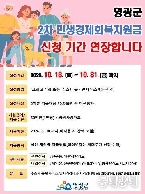 동네방네 김형규 기자 | 영광군은 전 군민에게 50만 원(2차분)을 지급하는 민생경제회복지원금 신청 기간을 10월 31일까지 2주 더 연장한다.