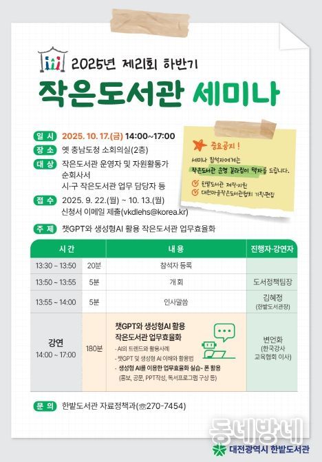 동네방네 김형규 기자 | 한밭도서관은 17일 금요일 오후 14시부터 구 충남도청사 소회의실(2층)에서 대전 지역 작은도서관 운영자와 자원활동가를 대상으로 세미나를 개최한다.