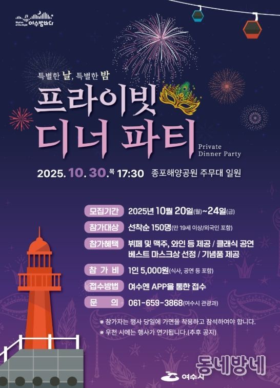 시 관계자는 “작년에 이어 올해도 이색적인 장소에서 시민과 관광객이 함께 낭만 밤바다를 즐길 수 있도록 프라이빗 디너 파티를 준비했다”며 “선선한 가을밤 여수의 매력과 낭만을 즐길 수 있는 이번 행사에 많은 관심과 참여를 바란다”고 전했다.