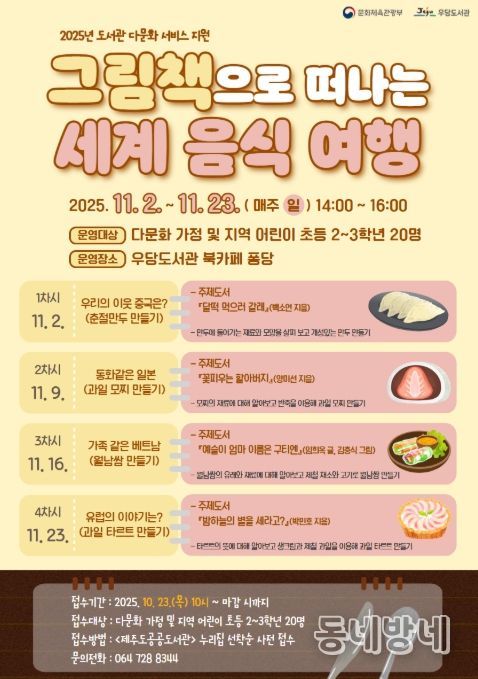 동네방네 김형규 기자 | 제주시 우당도서관은 2025년 도서관 다문화 서비스 지원 사업인 ‘그림책으로 떠나는 세계 음식 여행’ 프로그램 참여자를 10월 23일부터 선착순 모집한다.